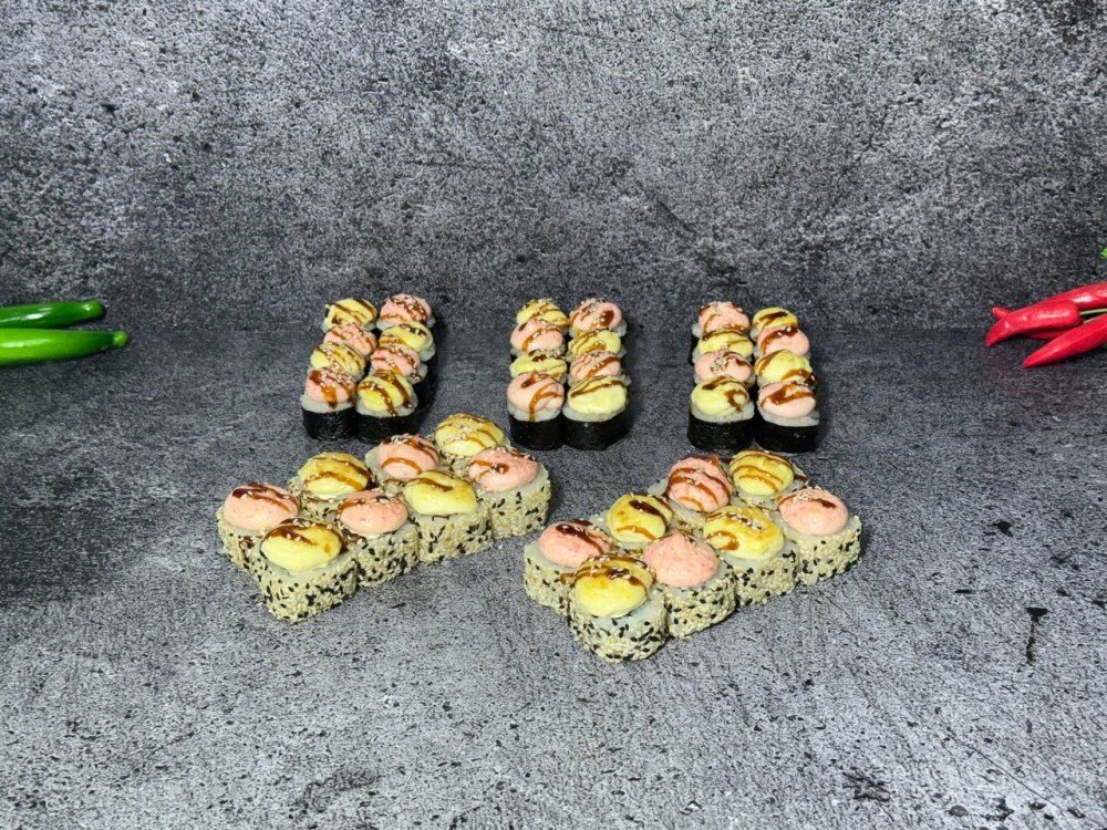 Ролл «Африка» запеченный, ролл «Аризона» запеченный, ролл «Чикен чиз» запеченный ролл «Горячий лосось» запеченный, ролл «Горячий краб» запеченный